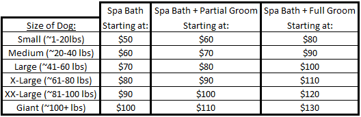 Pricing for grooming is determined by how long it takes to complete the requested services, as well as the material costs for supplies used to provide the service. The prices listed below are rough estimates and a general guideline only and as a starting point only, as numerous factors may increase or otherwise impact the cost of a grooming, such as the length, type, and volume of hair that a pet has, as well as the condition of their coat, such as matting, excessive dirt/grease, burrs, etc, which may take longer to brush, cut, or clean and dry as a result. Behavioral or health factors that require extra time in the process or that require the help of additional hands, or using specialty shampoos or dyes that require extended soak times are also factors that ultimately impact cost.
